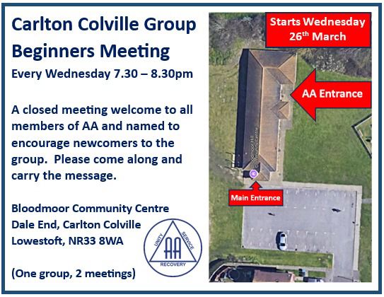 The Sunday night Primary Purpose Meeting, in Lowestoft, is moving venue on 23rd of February to: Salvation Army, Carlton Road, Lowestoft, NR33 0RU. Meeting runs 6-7pm. Parking at Royal Green Carpark. All welcome.