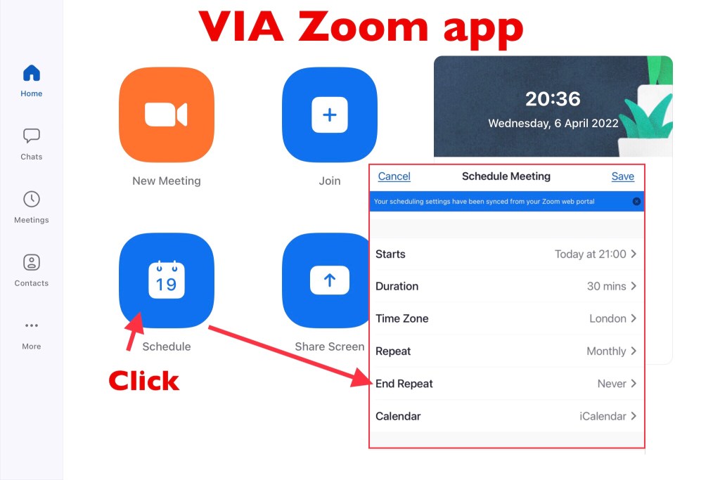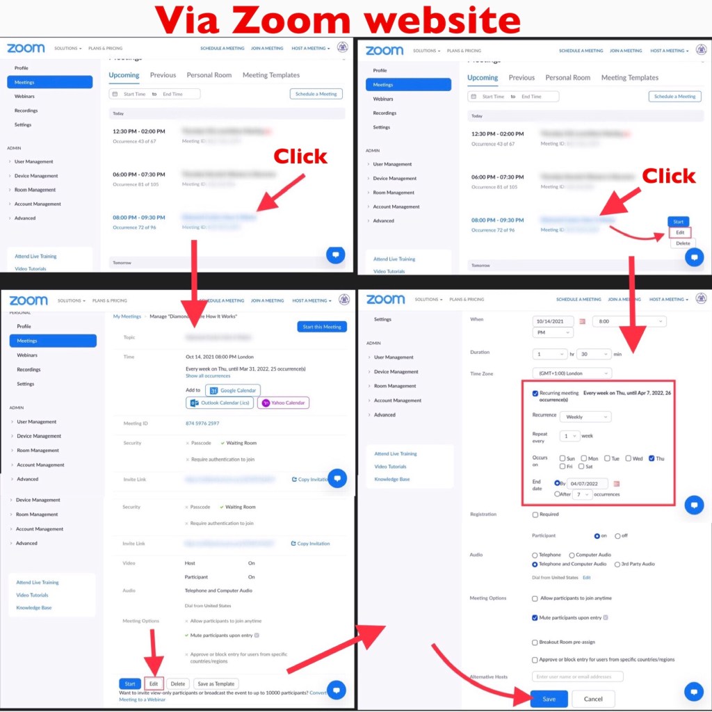 Don’t forget to regularly edit your group’s date stamp and keep it scheduled well into the future. Otherwise it will time out and you’ll have to set up a new meeting on Zoom, with new joining details to tell everyone about. To do this go to ‘EDIT’ for your meeting. See below for how you can do this via the Zoom website. If you’re setting it up on the Zoom app, you should be able to leave the end date open.